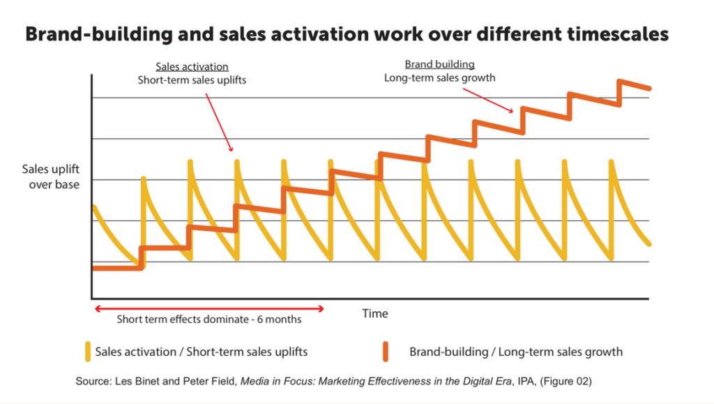 Podľa Content Marketing Institute až 64 % marketingových odborníkov priznáva, že nie sú schopní udržať rovnováhu medzi výkonnosťou a budovaním značky. Výskum Lesa Bineta a Petera Fielda však jasne ukazuje, že budovanie značky a aktivácia predaja fungujú v úplne odlišných časových horizontoch – a navzájom sa dopĺňajú.